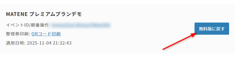 「プレミアム機能 適用済みイベント」一覧から「無料版に戻す」ボタンを押し、イベントA(プレミアム化済)のプレミアム権限を削除します。